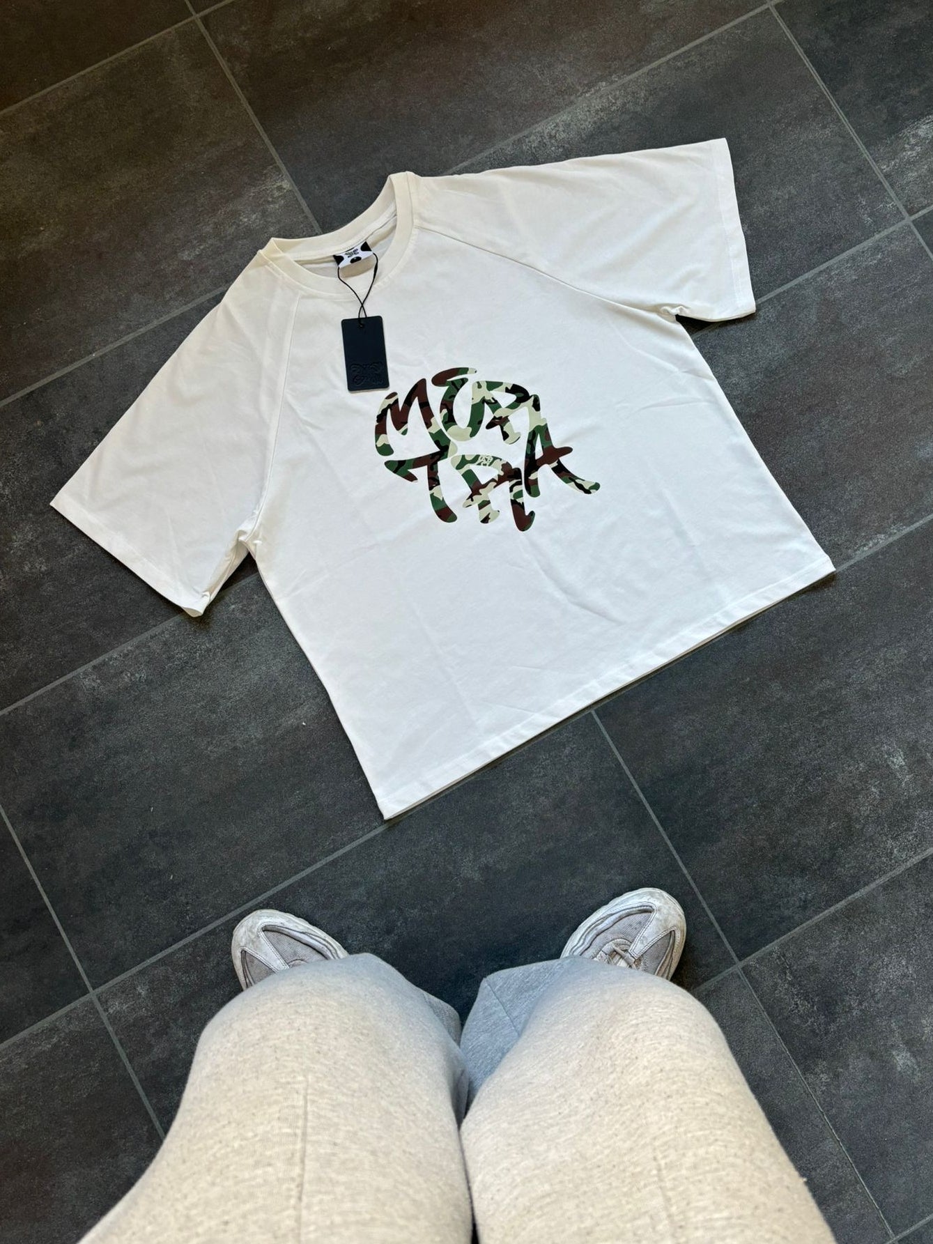 Mertra White & Camo Cropped Graphic Tee
